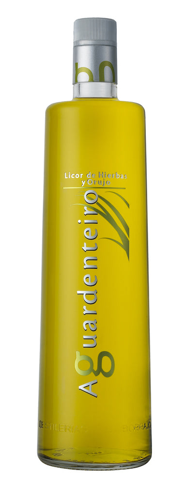 Schon seit dem 17. Jahrhundert wird Orujo im spanischen Galicien hergestellt. Es war ein Geheimnis der dort ansässigen Klöster. Mit der Zeit lernten auch die Winzer, ihre Rückstände der Weinmaische weiter zu verarbeiten und gegen Ende des 20. Jahrhundert wird ein Gütesiegel für diesen außergewöhnlichen Brand aus Galicien vergeben. Im Aguardenteiro bildet genau dieser Brand die Basis des Orujo de Hierbas, des Kräuterlikörs, der aus ihm erschaffen wird. Sonnengelb leuchtet er seither durch seine hochwertig schöne Flasche hindurch und wartet drauf, genießerisch getrunken zu werden.